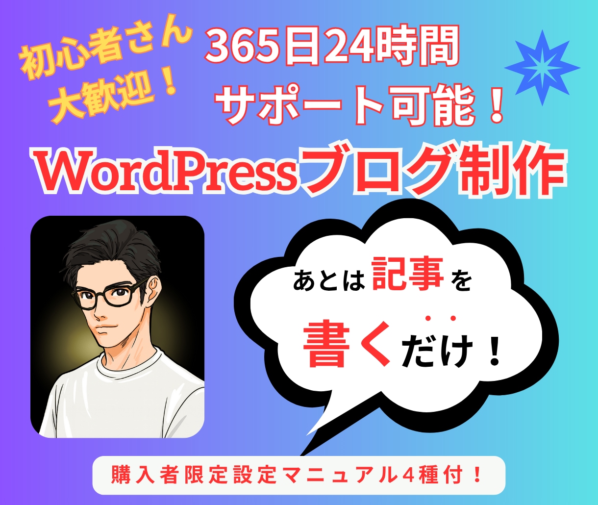 設定ゼロでOK!WordPressブログ制作します 完全丸投げOK!365日サポート+限定マニュアル付き! | ココナラ ☆365日24時間サポート可能☆☆ブログ設定に必要な4つのマニュアル付き☆【こんな悩みありませんか?】✅ブログのやり方がわからず挫折✅WordPressの初期設...